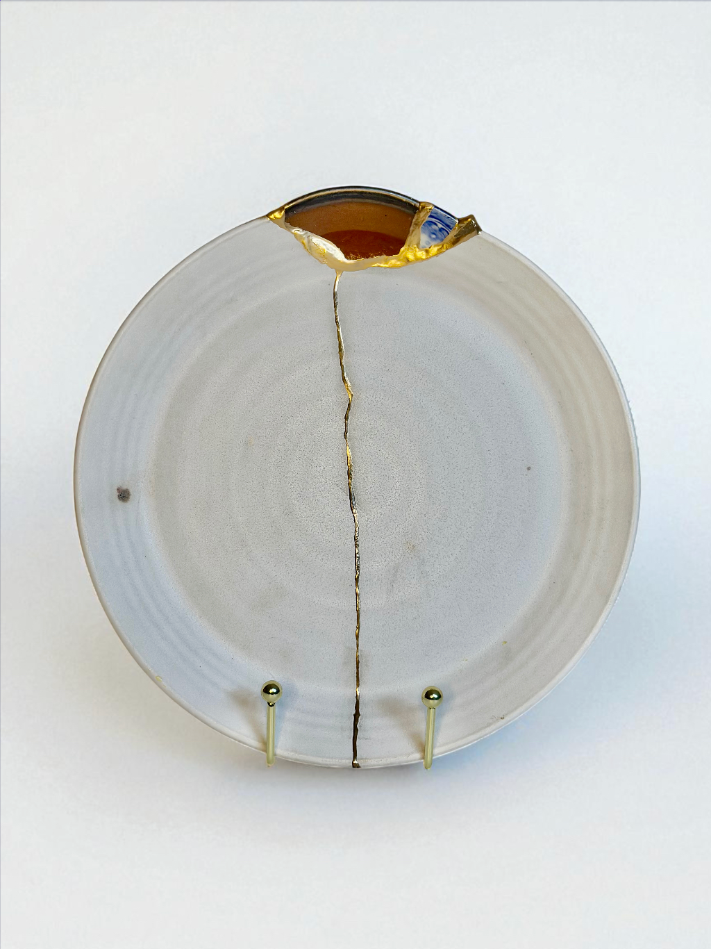 Uma história de transformação contada em ouro e cerâmica. Este prato único nasceu da união de fragmentos recolhidos e esquecidos, que encontraram nova vida através de uma técnica ancestral japonesa de reparação com ouro.